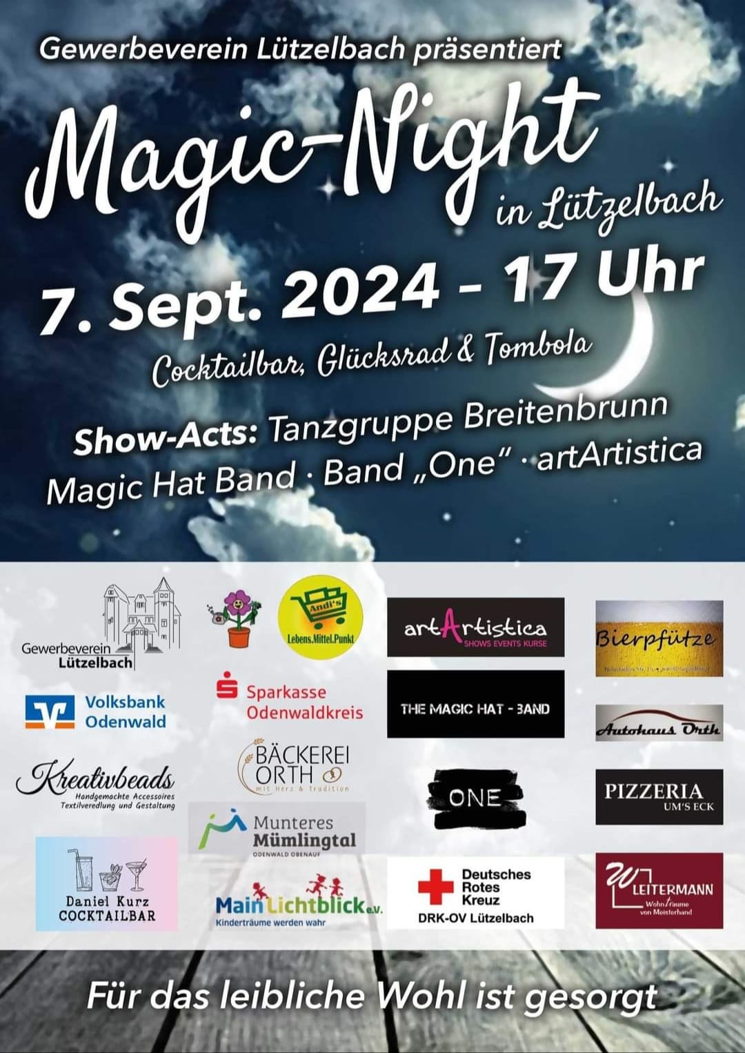 | "Magic Night" Open Air am 07.09.24 im zauberhaften Lützelbach, zusammen mit Band "One", artArtistica und der Tanzgruppe Breitenbrunn freuen wir uns auf einen wunderschönen Abend! -ab 17 Uhr lädt der Gewerbeverein ein- ![]() Lützelbacher Magic Night |